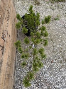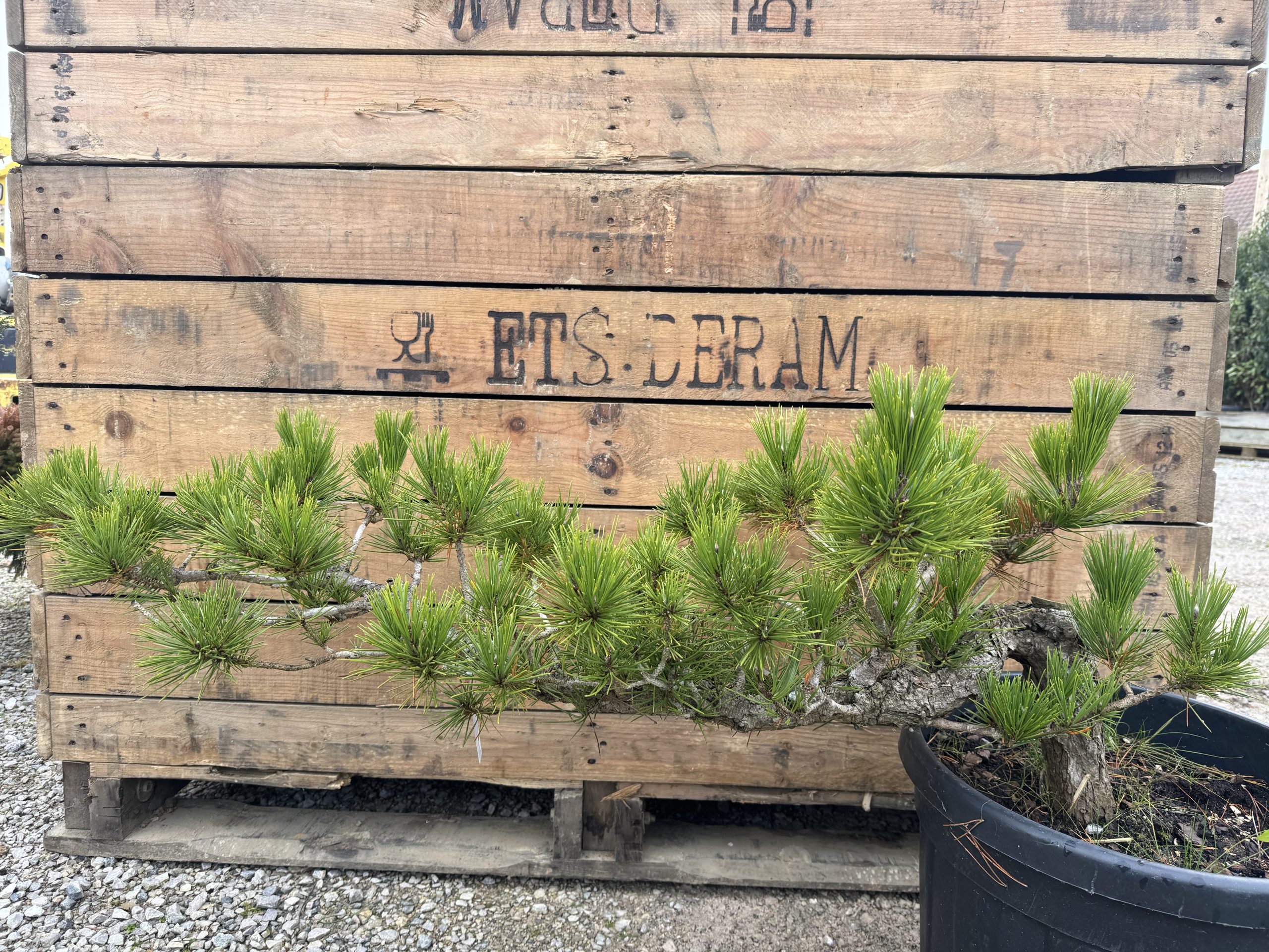 Pinus thunbergii (pin noir du Japon) cultivé en forme cascade, une technique de taille et de formation propre au bonsaï ou aux arbres de jardin stylisés. Dans cette configuration, l’arbre est orienté de manière à ce que ses branches et son tronc descendent progressivement vers le bas, imitant le mouvement naturel d’une cascade. Les branches sont soigneusement taillées et guidées pour créer des courbes fluides et des niveaux successifs qui donnent l’impression que l’arbre « chute » doucement. Cette forme évoque une image de force et de grâce, tout en mettant en valeur les caractéristiques du pin, telles que son feuillage dense et sa texture unique. Le travail de mise en forme vise à équilibrer l’aspect esthétique de l’arbre avec sa croissance naturelle, pour un résultat harmonieux et captivant.